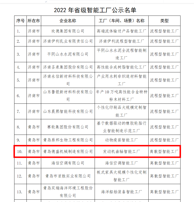 1、近日,山東省工業(yè)和信息化廳公布了2022年山東省級(jí)智能工廠(chǎng)(數(shù)字化車(chē)間場(chǎng)景)名單,我公司成功列入山東省智能工廠(chǎng)。